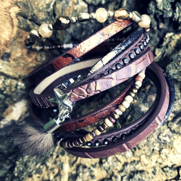 De armband ademt Ibiza style, vind je niet? Dat komt door het ‘wrap’ effect van de banden in combinatie met de verschillende materialen, bedels en fijne details die dit polssieraad een extra hippe uitstraling geven.