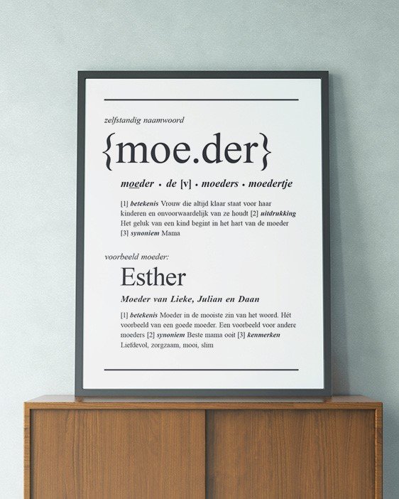 Dat maakt een moeder tot de allerliefste moeder, toch? Hoe leuk is het dan om haar te verrassen met een poster, die je naar eigen smaak kunt aanpassen. Kies het ontwerp en het formaat, waarna je de poster helemaal naar eigen wens kunt personaliseren. Kies haar favoriete kleur(en), vul jouw/jullie namen in en de gewenste teksten. Zo ontstaat het meest persoonlijke Moederdaggeschenk voor de allerliefste mama.