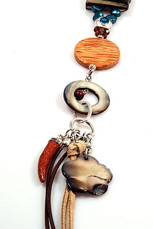 Deze lange ketting heeft een bovenafmeting van 62cm en onderlengte van 28 cm. De ketting is van heel veel verschillende kwaliteitsmaterialen gemaakt waaronder glas, hout, schelp, bone, zoetwaterparel, leer, goudsteen , suède, Swarovski, en nikkelvrij metaal. De ketting biedt een trendy palet aan kleuren van lichtbruin, petrol, turkoois, antraciet en de metaalkleur antiek zilver. Need we say more?