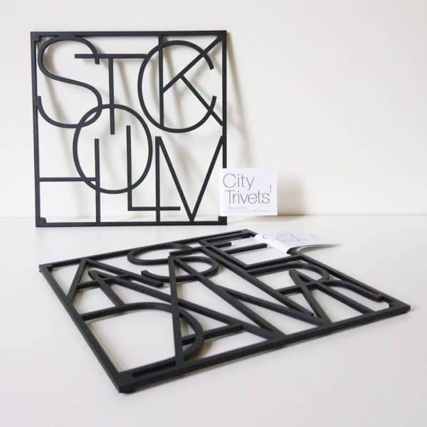 De City Trivet is een grafisch en solide vormgegeven onderzetter, gemaakt van poeder gecoat Zweeds staal. Een trivet is een onderzetter waarop een hete pan op het aanrecht of de eetafel kan worden geplaatst. Typisch voor een trivet zijn de hele korte pootjes met beschermende viltjes waardoor de onderzetter niet zelf de ondergrond raakt en de warme damp van de pan makkelijk kan ontsnappen en de ondergrond niet beschadigd raakt. De City Trivet is een ontwerp van Dick Lundgren van Men at Work en wordt gemaakt in Zweden. De collectie bestaat uit vierkante stalen onderzetters waarin grafisch de naam van een grote en bekende stad is verwerkt, zoals Amsterdam, Paris, Stockholm, Milano of New York. Ook veel Zweedse steden en eilanden maken deel uit van de mooie ontwerpen.