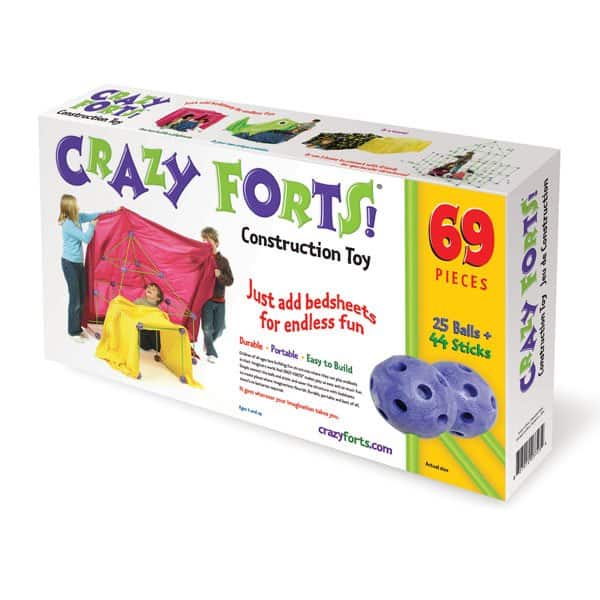 Met Crazy Forts bouw je wat je fantasie je ingeeft. Een iglo? Een kasteel, een huis of zelfs een raket? Je fantasie en het aantal stokken en bollen bepaalt de grens. Eindelijk een eenvoudig bouwsysteem dat snel en eenvoudig de leukste bouwsels mogelijk maakt! Het werkt heel eenvoudig, de kunststof stokken zijn gemaakt uit sterk, buigzaam kunststof die niet kunnen splinteren of splijten. Super veilig dus. Druk en draai de stokken in de ballen bouwen maar! Heb je nog wat oude lakens liggen, een oud gordijn of een zeil? Dan maak je de allergaafste bouwwerken helemaal af en ook nog eens in je eigen kleur.
