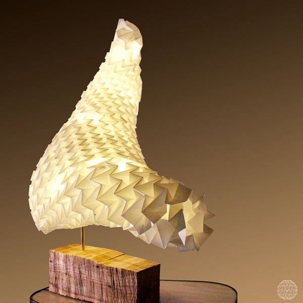 De origami lampen van Danielle hebben niet alleen verschillende vormen maar ze zijn ook verkrijgbaar in diverse kleuren. Wanneer je de gekleurde lampen aan doet geven ze een diepere en warmere kleur. Je kunt hier terecht voor hang-, sta en tafellampen in verschillende vormen en afmetingen. Wanneer je iets heel bijzonders zoekt, een prachtige lichtbron in de vorm van een sculptuur ook dan ben je hier aan het juiste adres. Fascinerende lamp sculptuur in een vrije vorm op een houten voet. Wat een indrukwekkende schoonheid.