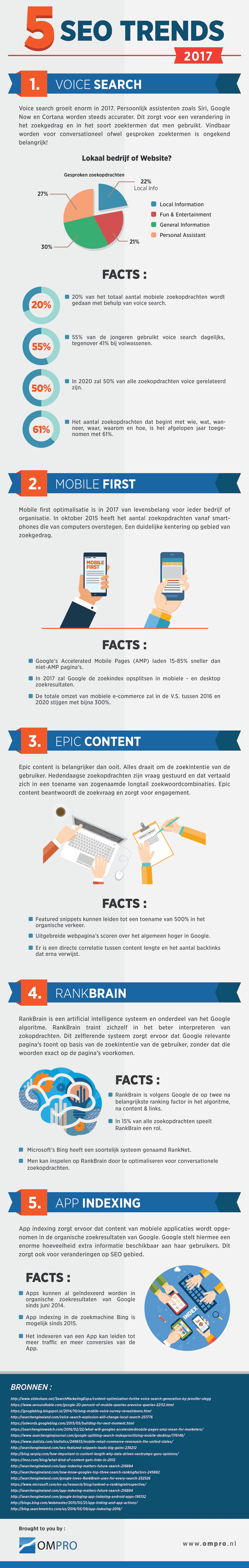In 2017 draait het allemaal om gesproken zoekopdrachten, de kwaliteit van je content, RankBrain, goede mobiele weergave en Apps die ook in organische zoekresultaten verschijnen. Handig om te weten? Maar wat kun je ermee als webwinkelier? Op onderstaande infographic, gemaakt door Ompro.nl, kun je eenvoudig alle SEO tips en trends voor 2017 bekijken. Is jouw webshop klaar voor 2017?