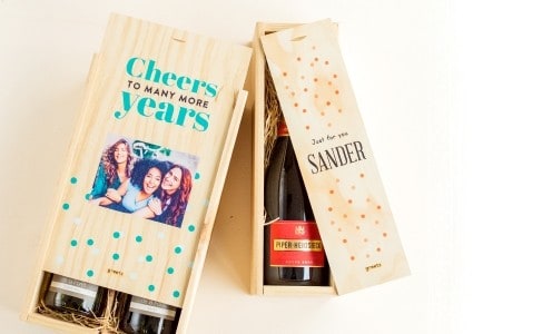 Voor de drankverrassingen waarbij dit niet kan, hebben we ze nu iets nieuws en heel moois. Je kunt namelijk jouw drank laten inpakken in een zelfontworpen houten kistje met naam van de ontvanger en/of een leuke, grappige of lieve foto. Zo pak je écht uit 😉 Proost!