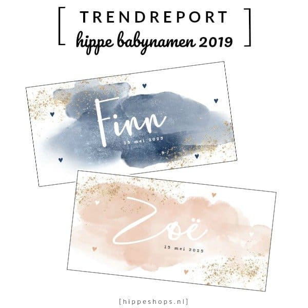 Hippe babynamen top5 voor 2019 op stijlvolle geboortekaartjes in langwerpig formaat. De kaarten hebben trendy kleuren en zijn versierd met gouden spetters – Koningkaart.nl
