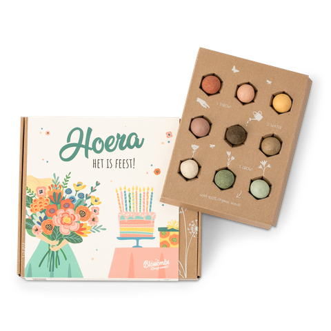 Niets feestelijkers dan een boeket bloemen voor een geslaagde. Maar die bloemen staan gemiddeld maar een week. Verras de eindexamenkandidaat een compleet origineel cadeau met dit brievenbuspakketje ”Hoera, het is Feest!” Met deze fleurige bloembommetjes giftbox in luxe cadeauverpakking zorg je gegarandeerd voor een lach op het gezicht van de blije geslaagde. Want die mag de zaadbommetjes gooien waarmee maandenlang mooie bloemen bloeien in de tuin of op het balkon.
