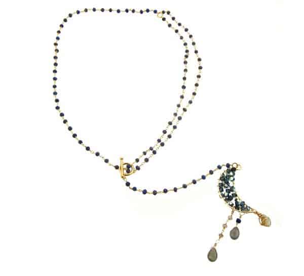 De Over The Moon ketting is gemaakt van 14 karaat goldfilled gouddraad, lapis lazuli en labradoriet edelstenen en sprankelende blauwe Swarovski Elements kristallen. De lapis lazuli ketting is 50 centimeter en heeft een leuke speelse verlenging van 18 centimeter. Het prachtige stralende maan symbool is 8 centimeter lang