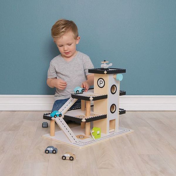 Tijdloos design en toch helemaal van nu, gemaakt van het mooiste hout. Dat is bijvoorbeeld deze geweldige parkeergarage. Een houten parkeergarage met een monochrome touch, een benzinepomp en een helikopter op het dek. En dan hebben we het nog niet eens over de autootjes die erbij zitten. Of wat dacht je van de lift? Speelklaar en oogstrelend mooi. Een prachtig stuk duurzaam speelgoed van Jabadabado waar heel wat kindjes mee kunnen spelen, en waar zelfs de volgende generatie hun fantasie de vrije loop kunnen laten.