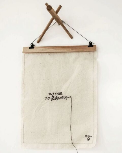 Bij HANGon, de webshop met de hipste spullen voor aan de wand, vind je verschillende series van de linnen stitched art posters in A3 formaat. Ze zijn beschikbaar in gelimiteerde oplages en elk exemplaar is genummerd. De wanddoekjes zijn op te hangen aan een subtiel ophangsysteem die je erbij kan bestellen bij HANGon. Maar je kan zo’n stitched art piece ook inlijsten of heel simpel met tape aan de muur bevestigen.