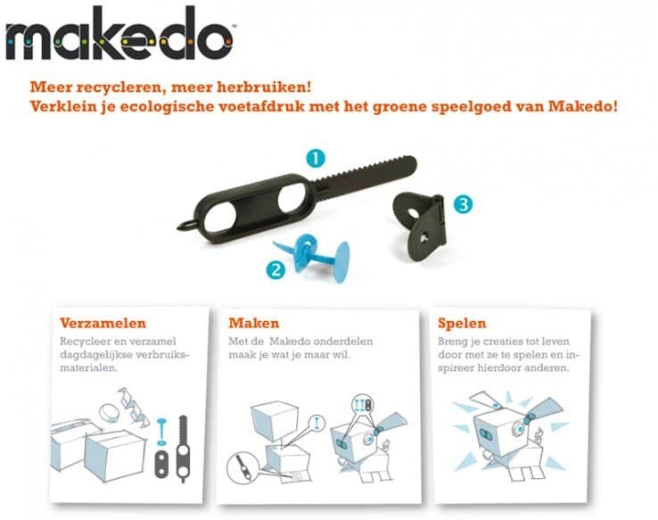 De pakketten van Makedo bevat het speciale Makedo gereedschapstool en een bepaald aantal verbindingsstukken en scharnieren. De materialen die je nodig hebt moet je zelf thuis bij elkaar zoeken en bestaan dus uit de lege dozen, flessen of eierdozen want recyclen staat bij Makedo centraal. Bijna alles wat je in huis kan vinden is bruikbaar, want met Makedo tover je deze materialen in een mum van tijd om tot de meest fantastische dingen: klokken, auto’s, robots, huizen, kostuums of muziekinstrumenten. De mogelijkheden zijn eindeloos. Dankzij Makedo wordt er opnieuw waarde gegeven aan de dingen die anders alleen maar beschouwd worden als afval.