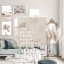 Minimalistisch maximalisme hoeft niet gepaard te gaan met felle kleuren. Kies eerder voor een palet van gedempte tinten zoals zacht grijs, crème of bijvoorbeeld wat meer levendiger pastelkleuren zoals Peach Fuzz. Dit zorgt voor een kalme basis waarop weelderige accenten kunnen schitteren.
