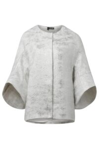 Details: Deze elegante witte blazer met zilveren garen voegt een verfijnde touch toe aan elke outfit. De wijde mouwen en ronde halslijn geven het een moderne twist, terwijl de couture-geïnspireerde details zorgen voor een luxueuze uitstraling. Perfect om over een blouse te dragen voor formele gelegenheden, maar ook leuk om casual te combineren met een jeans en sneakers.