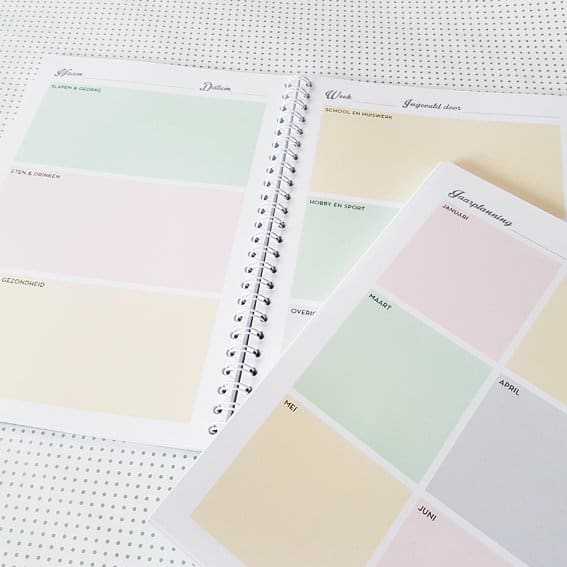 Achterin het boek staat een jaarplanning waar grote gebeurtenissen kunnen worden ingevuld zoals vakantie, uitstapjes, schoolreisjes of logeren.