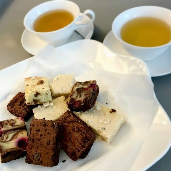 De Irresistible Cheescake-Raspberry Brownie geeft een speciaal effect: hier heb ik het idee dat ik een cheesecake aan het eten ben. Deze brownie is wat gladder en compacter dan de andere Traditional Chcocolate Brownie. Het heeft een mooi gemarmerd effect met kleuren die helemaal bij de cheesecake smaak passen. Het lijken wel kleine kunstwerkjes.