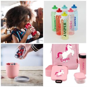 Design je eigen hippe broodtrommel, beker of fles met naam