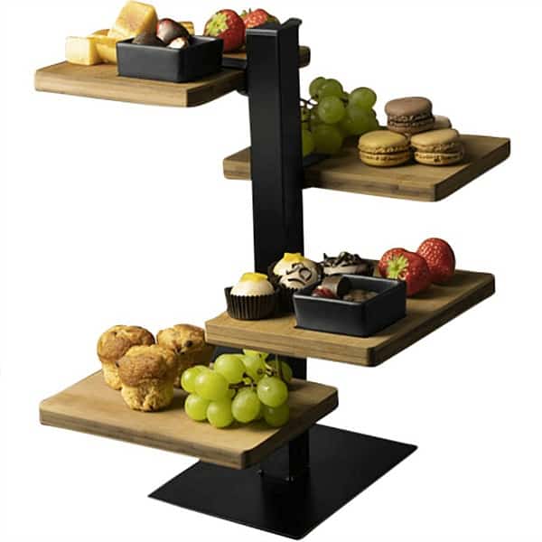 De Gusta serveerset is verkrijgbaar in drie of vier verschillende niveaus en bestaat uit een metalen standaard met houders waar je houten plankjes in kunt plaatsen. Zo kun je heel mooi je hapjes presenteren bij een high tea of buffet. Het hippe en moderne alternatief voor de klassieke etagère.