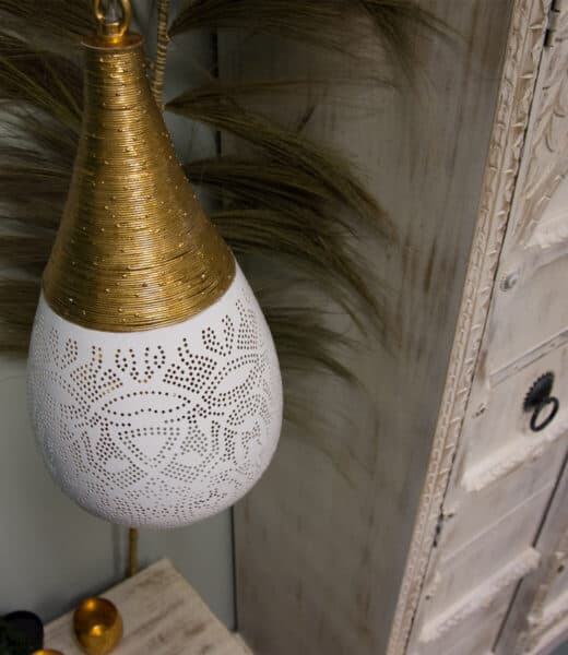Deze toffe witte lampen met filigrain (het uitgesneden patroon) zijn wit aan de buitenzijde. Mooi, rustig en heel ingetogen. De binnenkant is pure luxe, deze is namelijk gemaakt van bladgoud. Wat een hele warme sfeer brengt wanneer je de lamp aanzet. Zo’n hanglamp wil je hebben.