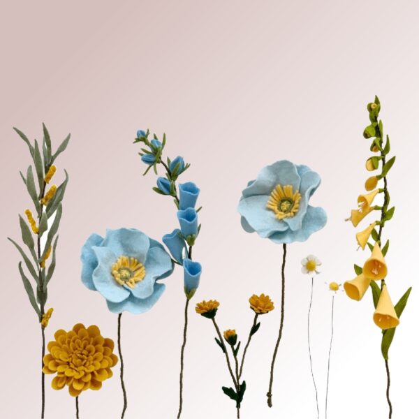 Breng de natuur naar binnen met de Winterse Viltbloeiers van de Viltbloemist. Deze zorgvuldig gemaakte viltbloemen voegen een warme en elegante touch toe aan je interieur.