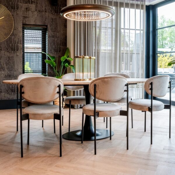 De vorm van je tafel doet meer voor je eetkamer dan je misschien denkt. Ronde en ovale tafels nodigen uit tot gezelligheid. Iedereen zit dichter bij elkaar en gesprekken verlopen vanzelf makkelijker. Zeker wanneer de ruimte wat kleiner is, is een ronde of ovale tafel een slimme keuze omdat er meer bewegingsruimte overblijft. Een lange rechthoekige tafel daarentegen geeft juist een royale uitstraling en is ideaal als je vaak gasten ontvangt of een grote ruimte wilt vullen.