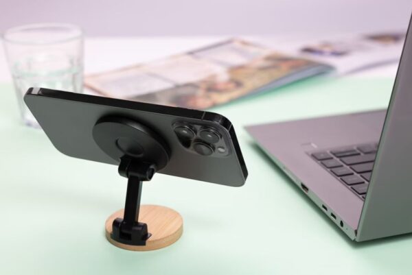 Deze Magmount RCS gerecycled plastic en bamboe telefoonstandaard prijkt op elk bureau met jouw bedrijfslogo